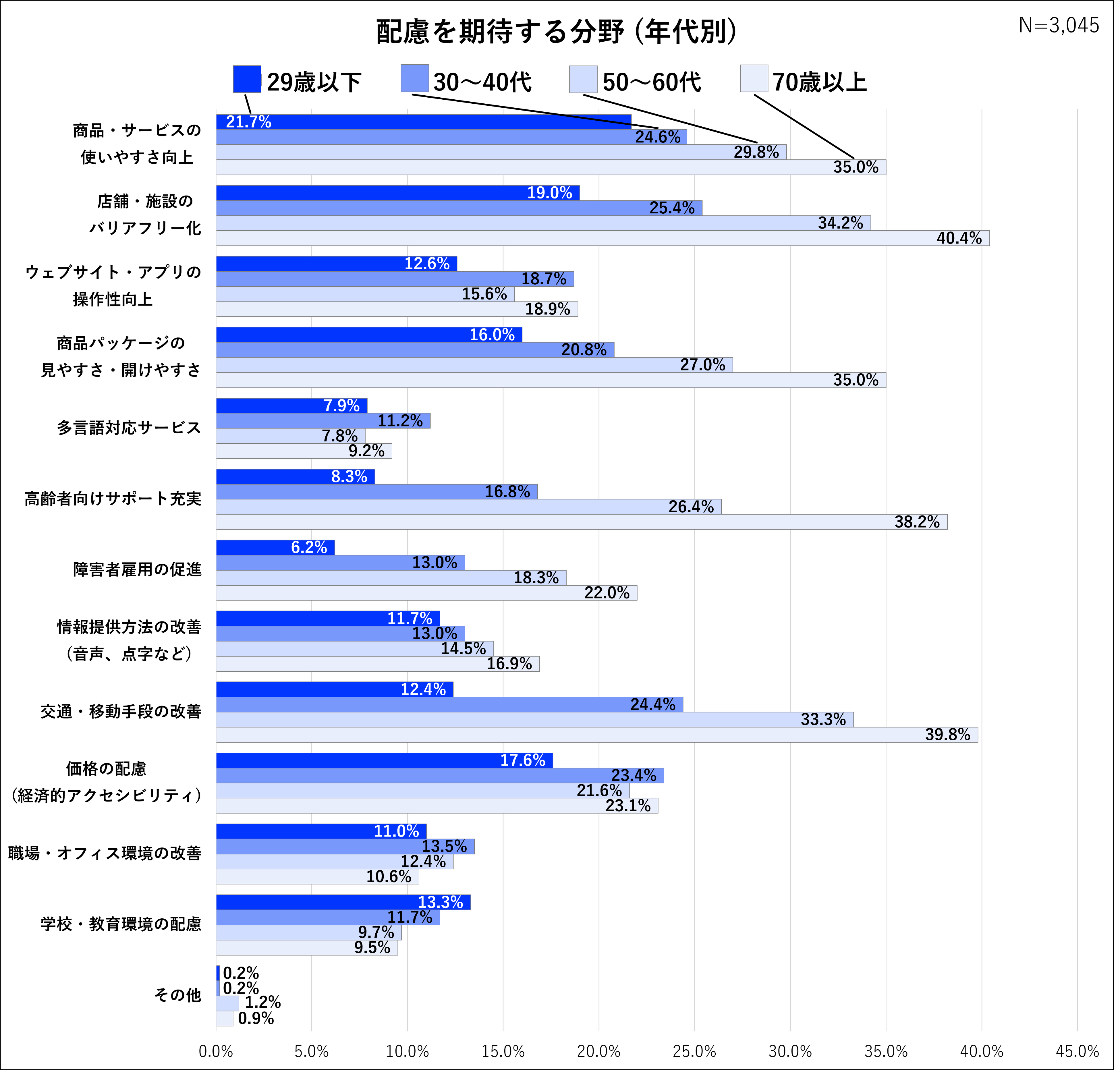 ・70代以上:「店舗・施設のバリアフリー化」(40.4%)や「交通・移動手段の改善」(39.8%)が突出しており、外出や移動における物理的ハードルの解消が強く切望されています。