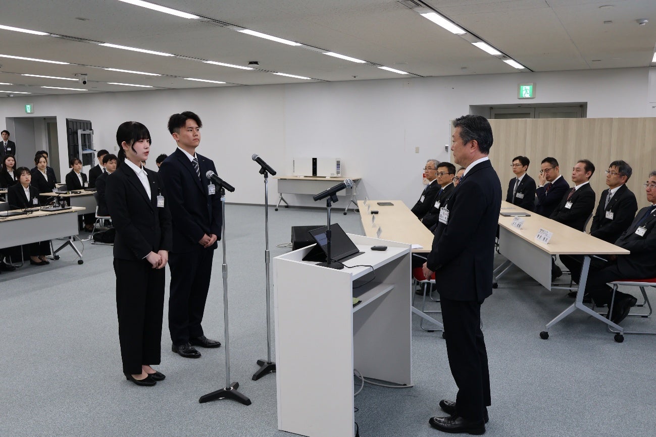 シャープは、本日、大阪市中央区にある本社会場にて「2026年度入社式」を開催しました。新入社員313名が参加し、社長執行役員CEOの河村哲治の祝辞の後、新入社員代表2名が入社にあたっての抱負を述べました。最後に当社会長の劉楊偉からもビデオメッセージで新入社員を激励しました。