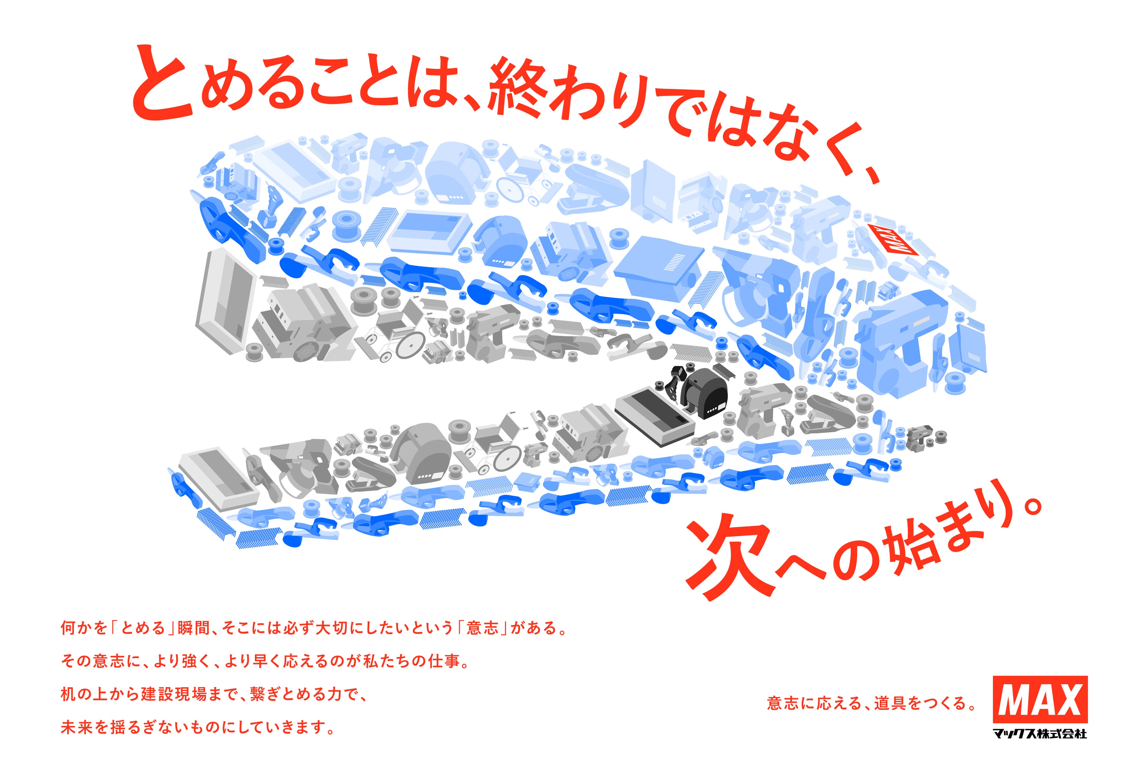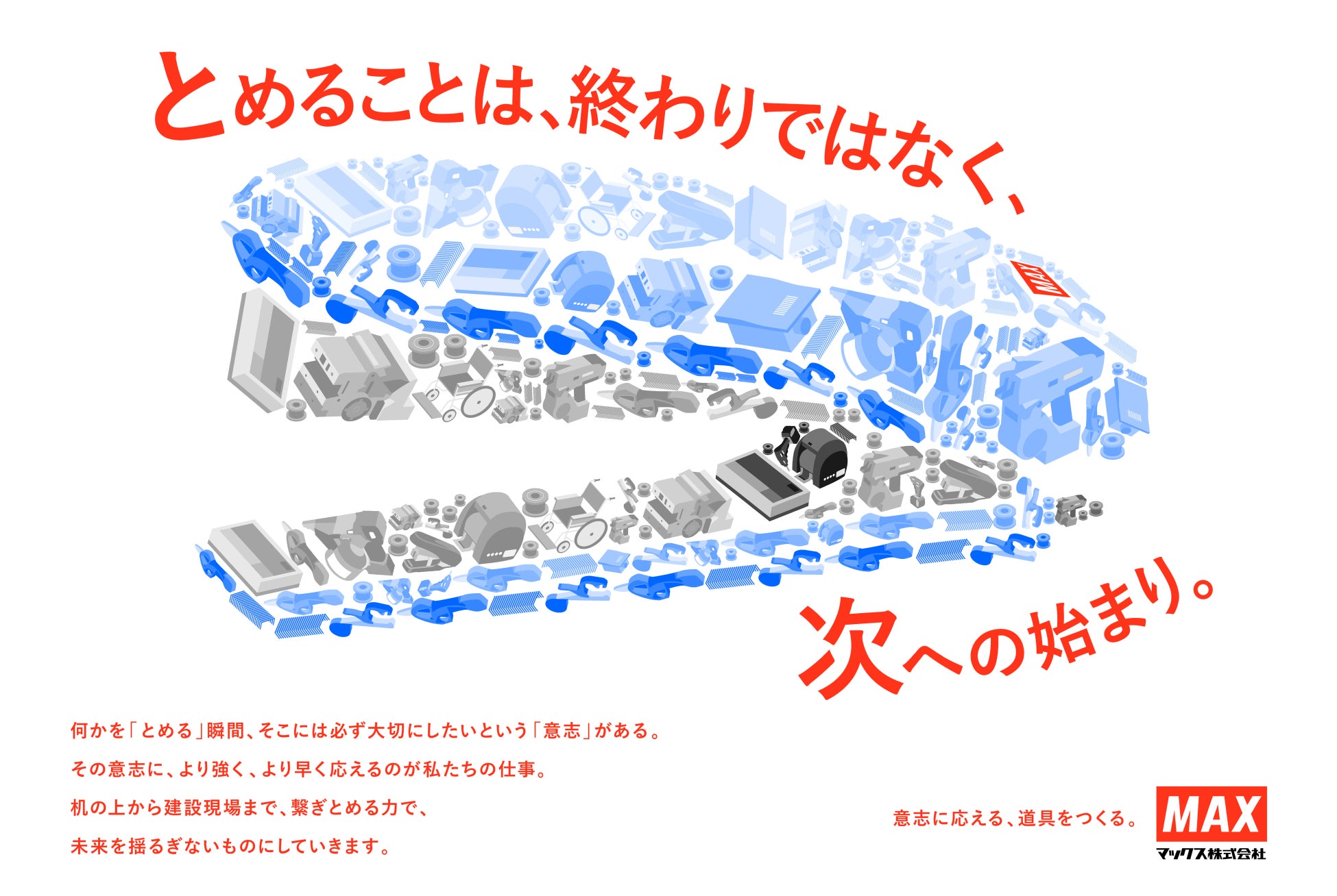 本広告は、当社が幅広い事業を展開していることを周知することを目的とし、ホッチキスで親しまれているイメージを活用しながら、多様な製品がマックスの事業を構成していることをイメージしたデザインとしました。本社最寄り駅である茅場町駅へ掲出することによって、当社に対する興味・関心の喚起および企業認知の向上を目指します。