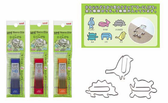 デザインフィルが展開するプロダクトブランド「ミドリ」の人気シリーズ「D-CLIPS(ディークリップス)」が、三菱鉛筆の人気シャープ替芯「ユニ ナノダイヤ」限定パックのノベルティとして採用された。オリジナルデザイン全6種類(ペンギン、ウサギ、ハリネズミ、カメ、ゾウ、トリ)の中から3種類がセットになった「ユニ ナノダイヤ D-CLIPS付き限定パック」は税込み価格210円。