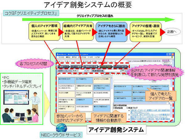 具体的には、コクヨの「クリエイティブプロセス」の技法である「①個人のアイデアを蓄積」、「②組 織内でアイデアを共有」、「③組織内でアイデアをさらに創出」、「④創出されたアイデアの整理・選抜」の4つの基本プロセスを、NECのクラウドサービスを利用して、WEB上でパソコンや多機能データ端末等から、複数のユーザーが同時に作業することができる。