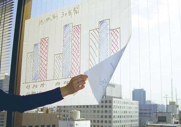 新製品は、静電気の力で平らな壁面などに貼りつき、ホワイトボードのように文字の書き消しができるポリプロピレン製の極薄(50μ)シート。静電気だけで貼り付くので、貼りはがしが簡単。平滑面であれば、スチール、ガラス、木、紙など様々な場所に貼りつく。表面も帯電しているので、メモや領収書など薄くて軽い紙なら貼りつけることができる。オフィスの壁や窓ガラスに貼ってホワイトボードのように使用したり、冷蔵庫に貼ってメモ代わりにしたり、家の壁に貼って子供の落書きに用いたりと、オフィスでも家庭でも工夫次第で色々な使い方ができる。