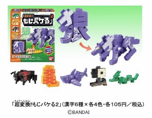 バンダイは、“一文字の漢字”を組み替えて、その漢字を立体的な動物に“変換”することができるオリジナルトイ付き玩具菓子「超変換ちょうへんかん!!もじバケる」の第二弾「超変換ちょうへんかん!!もじバケる2」を12月13日から順次発売する。漢字6種×各4色・税込価格105円。