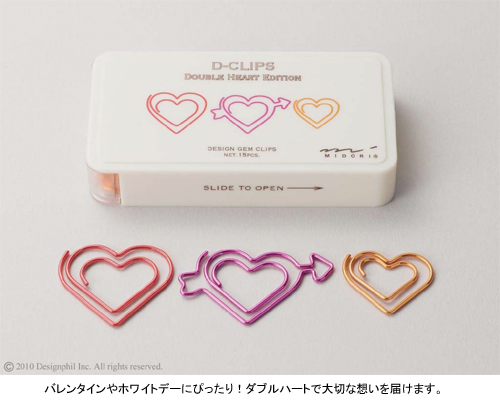 新商品は、留めた時に紙の表裏どちら側もハート型になるクリップで、昨年の「ダブルハート柄」に続く、第2弾。大・中・小のサイズごとに赤・ピンク・オレンジそれぞれのメタルメッキ塗装で塗り分けている。また、ピンクのハートのみ、恋の象徴として用いられるキューピッドの矢が刺さったデザインに仕上げた。