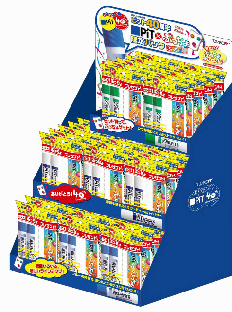 「PiT×ぷっちょ限定パック」で、口紅型固形のり「PiT」が発売40周年を迎えた記念キャンペーン。PiTの3タイプSサイズ2本を1パックにして、景品としてヨーグルトソフトキャンディ「ぷっちょ(ミラクル味)」がセットされたもの。UHA味覚糖とのコラボでPiTオリジナルパッケージ入り。限定パックセットは3種50パックで1万2,000円。3月18日から出荷。