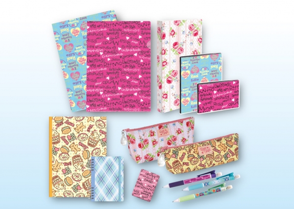 アイテムは、ノート、アルバム、シャープペンシル、ペンケース、光るLEDパスケースなど、10アイテム、50品番。授業や通学、生活の中で使用頻度の高い商品をセレクト。少女らしい可愛らしさをフリルやチェック、ハートやスイーツなどのモチーフに春・夏を意識したカラーリングで表現した。