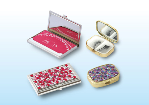 アイテムは、アイラッシュケースやミラーなど化粧用小物と、カードスタンド、シザー、などのステーショナリーで、7アイテム、12品番。ステンレスなどの金属にアクリルストーンやクリスタルガラスを組み合わせて、キラキラと輝く繊細なディテールに仕上げた。