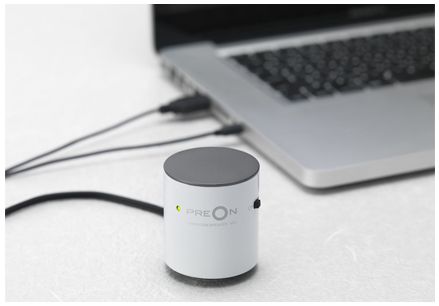「プレオン」は、本体色にビジネスシーンで活用しやすいホワイトを採用。コンパクトなサイズで携帯性に優れ、パソコンをはじめ、スマートフォンや携帯電話等の一般的な3.5㎜ヘッドフォン出力端子に対応。約3時間の充電で約3時間稼動し、充電しながら音声を出力することも可能。