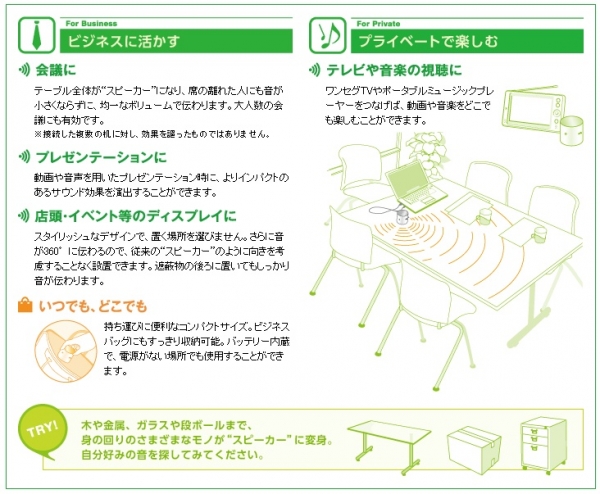 同社では、バイブレーションスピーカー「プレオン」の用途をビジネスパーソンのプレゼンテーションはもちろん、スカイプ等を使った会議、大学の授業やセミナーなどと想定し、知的生産性の向上のツールとして提案する。