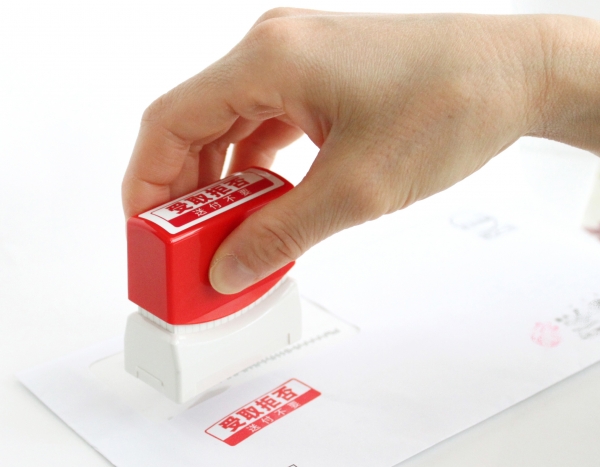 「拒否ポン」は、スタンプ台無しでも連続捺印ができる浸透印で、手間をかけず簡単に 迷惑な郵便物の返還を行うことができる。