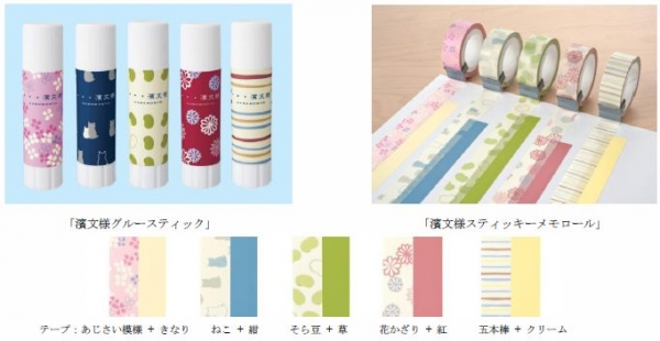 『濱文様』は、横浜伝統の布染手法である捺染(なっせん)をベースに、ユニークな色と柄の世界を表現する和テイストのデザインテキスタイルブランド。主にてぬぐいやハンカチなど、和柄布製品を展開しており、日常に溶け込む洗練されたデザインが、女性に人気。最近では、女性が好む雑貨感覚のおしゃれな文具や女性向けの機能的な文具(『女子文具』)も注目されており、今回発売する「濱文様グルースティック」と「濱文様スティッキーメモロール」もまた、女性を意識した親しみのあるデザイン各5柄をラインアップした。