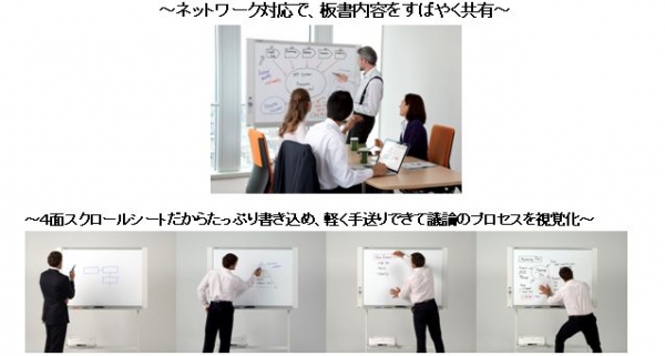 「N-204シリーズ」は、4面スクロールシートを搭載。一般的な片面タイプのホワイトボードと比べ4倍の情報を書き込むことができるため、その都度消すことなく議論を進めることができる。板面シートは両方向に軽く手送りできる新設計で、各板面の内容をすばやく振り返り、確認することが可能。思考を途切れさせることなく、会議の生産性が大きく向上させる。