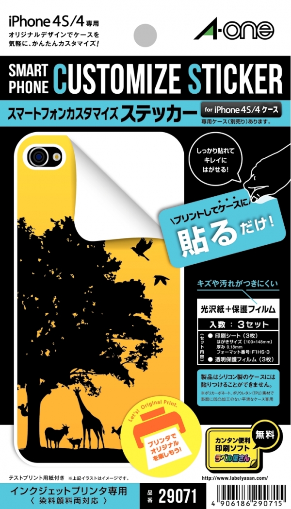 ステッカータイプとカードタイプがあり、お気に入りの写真やイラストなどをインクジェットプリンタで印刷し、ケースに貼ったり本体とケースの間に挟むだけで、自分だけのデザインに着せ替えできる。あらかじめiPhone4S/4 用のケースに合わせた切り込みが入っているので、自分でカットする必要がない。
