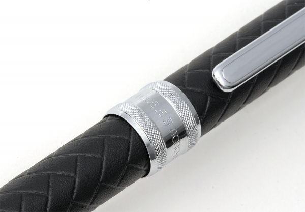 新製品は、牛本革の美しい所だけを職人が厳選。編み込んだ様な柄を革に型押し、クラシカルで大人の男性の手元で落ち着いた雰囲気を演出する筆記具。作業工程の革を巻く過程で困難な作業が「柄合わせ」ですが、同社35 年に及ぶ多機能筆記具生産の経験と技術が、ハンドメイドによるつなぎ目の解らない自然な結合面で一体感ある握り心地に仕上げている。