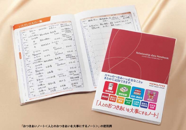 「おつきあいノート<人とのおつきあいを大事にするノート>」は、「自分の周りの人とのつながりをもっと大事にしたいので、相手のことや贈り物のやりとりなどを忘れないように記録しておきたい」というユーザーの声に応えた商品で。記入項目には、「いただいたもの」「さしあげたもの」「冠婚葬祭」「お年玉」「お気に入りの手みやげや飲食店」「おつきあいのある人のこと」などがある。さらに、家系図のように見やすい親族表ページや、趣味の仲間やインターネットを通じた知人、同僚・ご近所のことなどを気軽にメモできるページもあり、改まったことから身近なことまで、16種類の項目を盛り込んでいる。