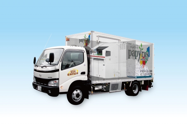 「エコポリスバン 大型シュレッダHS7500搭載タイプ」は、シュレッダを駆動させるための動力部に、PTOを使用して発電する発電機を採用、安定した電力で作業できる。また、発電機から電源を取ることができるため、電源供給車としての活用も可能で、災害など非常時の電源確保に役立つ。