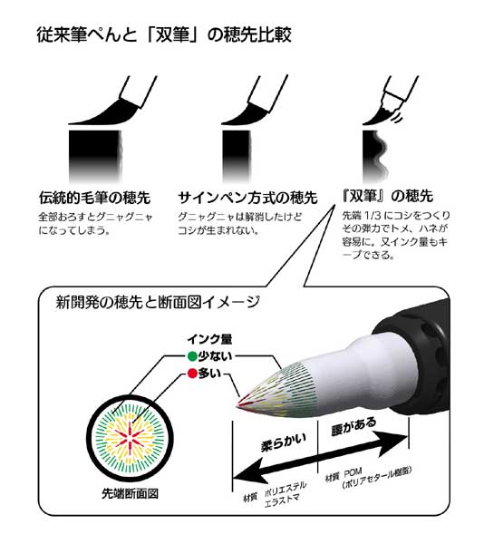 「双筆」の構造は、先端だけが柔らかく、後ろ部分はしっかりとしている為にコシがあり、多くの方々に筆のタッチを感じながらしっかりとトメ、ハネ、ハライが表現出来る。また、墨にあたるインクの量も、この穂先の中央部が最も多く、周囲に行くにしたがって少なめになるように設計。これによりハライのしなやかな筆跡が書ける様になり、特にハライに見られる筆独特の「適度なカスレ」も創ることが出来るようになった。