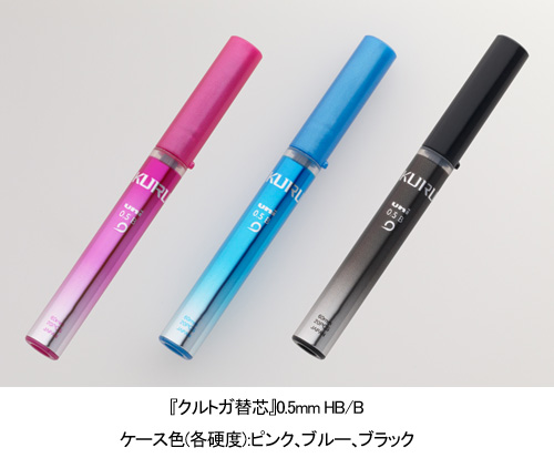 従来の芯は、外側が硬く、内側がやわらかい構造。それに対してクルトガ替芯は独自の新製法により、芯の内側が硬く、外側がやわらかい構造を作り出した。そのため、内側は削れにくく、外側は削れやすいので、トガりやすく、しかもなめらかに書くことができる。ケース色は、ピンク、ブルー、ブラック。