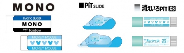 トンボ鉛筆は、「モノ消しゴムミニ」(105円)、「テープのりピットスライド」(294円)「消えいろPiT XS」(157円)を発売。幅広い世代から好まれるミッキーとミニーのシンプルなデザインに。