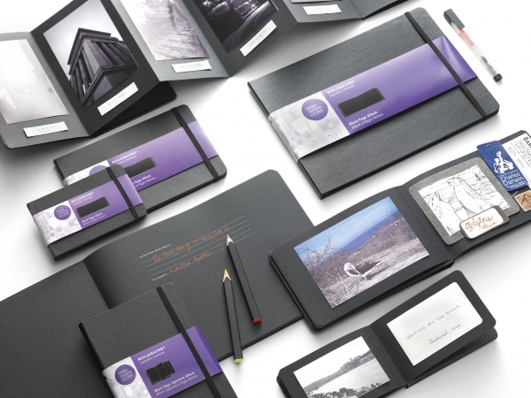 「ブラックページアルバム」は、写真を貼り付けてアルバムとして使えるのはもちろんのこと、スクラップブック、アート制作の画材など幅広い用途で使用できるようにデザインされている。横長に製本されたアルバムのサイズは、Pocket、Large、A4の3種類。なお、Largeサイズにのみ、ページが蛇腹状に開くジャパニーズアルバム式のレイアウトがある。通常のアルバムとしても、コラージュ、スケッチやノートなど様々なクリエイティブにも最適。