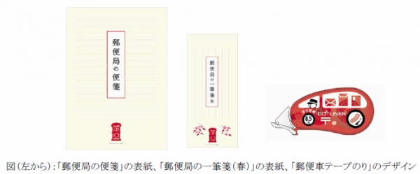 便箋、レターセット、ポストカード、一筆箋の4商品は、2009年6月から販売しているポスタコレクト商品をリニューアル。特に一筆箋は、ユーザーの声を活かして季節のイラストを加え、枚数を10枚として使いきりやすくなった。テープのりは、コクヨグループのコクヨS&Tが製造販売するテープのり「ドットライナープチ」をベースに、表面を郵便車のデザインに仕上げ、大人から子どもまで幅広く楽しむことができる。