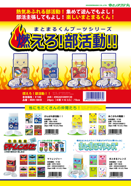 ヒノデワシは、人気のまとまるくんブーツ シリーズに新デザイン「燃えろ!部活動!!」を4月から発売する。デザインは、バレーボール、卓球、テニス、マラソン。本体価格は各180円。