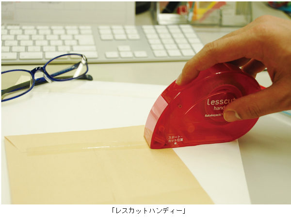 通常、テープ貼作業はテープを切ってから貼り付けるが、レスカットハンディーは貼ってから切ることでテープの無駄遣いを防止し、作業効率の向上も図れる。片手で作業できるので、両手がふさがらずポスターや掲示物の展示作業に便利。コンパクトサイズなので、カバンに入れて携帯でき、引き出しなどに収納できるので場所を取らない。ホワイト、ブルー、ピンク、グリーンの4色。