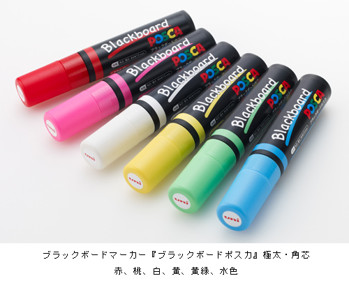 三菱鉛筆は、こすれに強い、水・雨に流れにくい、水ぶきで消せる新開発インクの「ブラックボードポスカ」に、大きい文字や広い面の塗りつぶしに便利な極太・角芯を7月29日から発売。