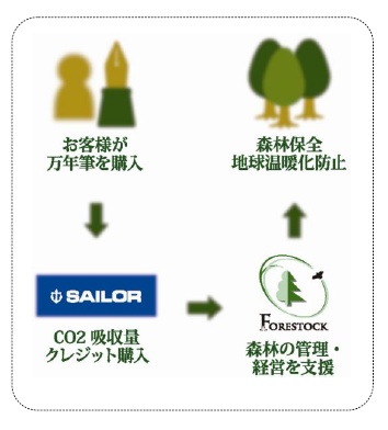 適応製品を選ぶと、その本数に応じて森を支援するためのCO2吸収量クレジットを同社が購入し、価格への転嫁はありません。国内で販売される小売価格3,150円以上の万年筆がフォレステーショナリーの適応製品。海外販売分、DAKS、マンハッタナーズ他、当社ブランドではないOEM 製品は適応外となる。