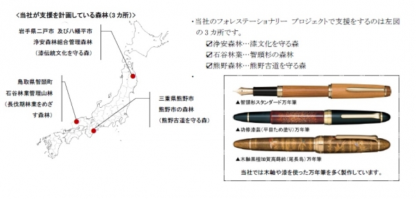 セーラー万年筆は、日本国内の森林機能の回復改善をめざすフォレストック認定制度を活用して、同社製品に所縁のある鳥取県智頭、岩手県浄法寺・安代、三重県熊野の3 カ所の森林の持続的管理・経営を支援する『FOREStationery®(フォレステーショナリー)』プロジェクトを開始する。