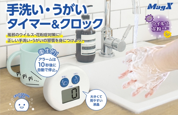 株式会社マグエックスは、ウイルスの感染症予防や風邪・花粉症対策などで正しい手洗い・うがいの習慣を身につけることができる「手洗い・うがいタイマー&クロック」を発売します。