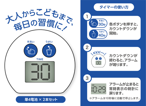 ホーム > 新製品情報・特集 > 毎日の正しい手洗い・うがいの習慣を身につけよう!「手洗い・うがいタイマー&クロック」発売