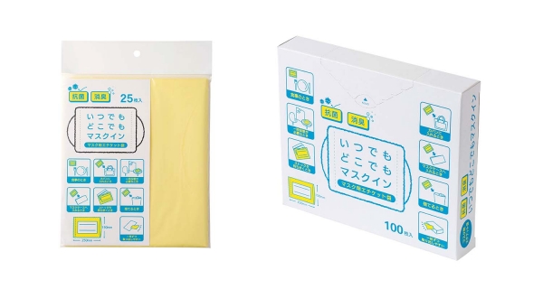ちょっとしたお出掛けや持ち歩きに便利な25枚入の携帯タイプと、オフィスやご家庭、お店などでストックしておける100枚入のBOXタイプをご用意しました。“新しい日常”でのマナーとして、マスクの持ち歩きや保管、処分に、ぜひお役立てください。