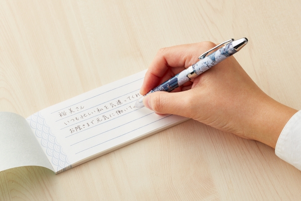和紙素材の一筆箋は、表紙だけでなく、中面にも青海波がデザインされています。縦書き・横書きどちらの向きでも使うことができ、さっと一言気持ちを添えるのに便利です。