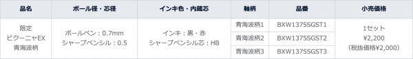 『ビクーニャEX 青海波柄』は、和雑貨メーカーである「谷口松雄堂」とコラボレーションし、なめらか油性インキを搭載した多機能ペン「ビクーニャEX」の軸に日本伝統の青海波柄を施した限定モデルです。ペンの柄とリンクした一筆箋と、うるし紙加工のペントレイをセットにして発売します。