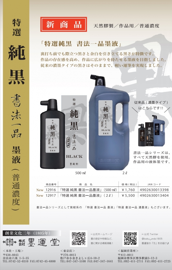 ホーム > 新製品情報・特集 > 墨運堂、黒さにこだわり開発した墨液「特選 純黒 書法一品 墨液」発売