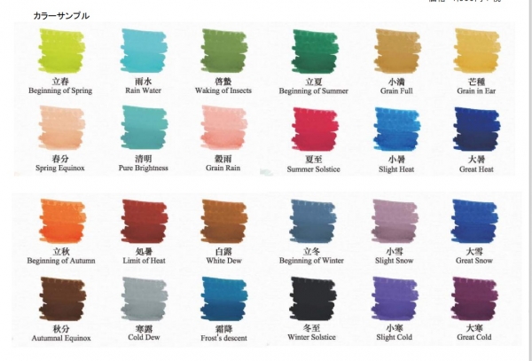 季節を表す二十四節気をモチーフにして作った万年筆インク。私たちは自然から与えられた季節の移ろいに、色彩を感じながら日々の生活を過ごしていますが、これがカラー・オブ・ネーチャー万年筆用インクのコンセプトです。