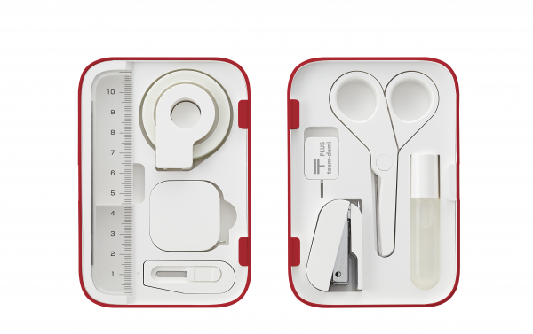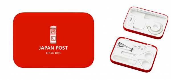 ・ケースは郵便ポストの色をイメージした限定レッドカラー、ケース内トレイと8つのステーショナリーはホワイトでキュートなイメージに仕上げています。「これさえあれば大丈夫」という安心感を与える最小限必要な 8つのアイテム【はさみ】【メンディングテープ】【液体のり】【カッター】【メジャー】【ホッチキス】【SIMカード交換用ピン】【定規】を収納。