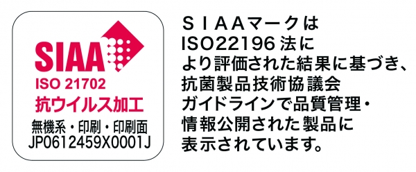 SIAA(抗菌製品技術協議会)とは、適正で安心できる抗菌・防カビ加工製品の普及を目的とし、抗菌剤・防カビ剤および抗菌・防カビ加工製品のメーカー、抗菌試験機関が集まってできた団体です。 「SIAAマーク」はISO21702法により評価された結果に基づき、SIAAが制定した抗菌のシンボルマークです。3つの基準(①抗ウイルス性②安全性③適切な表示)を満たした製品に、SIAAマークが表示されます。SIAAマークは、SIAA会員以外は使用できないことになっており、またその表示方法等の運用については協議会の自主管理によって厳しい市場監視が行われています。