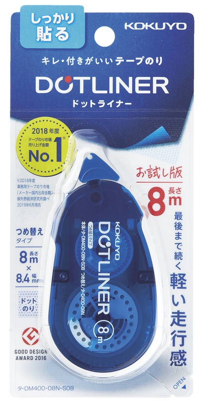 「ドットライナー」は、独自の塗工技術によるドットパターンのりで、キレ・付きが良いテープのりです。2020年にシリーズ全面リニューアルを実施し、本体・パッケージのデザインを刷新したほか、使い終わりまで続く軽い走行感を実現するなど、使いやすさも進化し続けています。