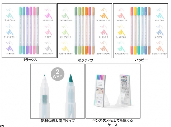 「気分」に合わせて選べるカラーカラーは、穏やかで上品な色味を揃えた「リラックス」、明るい気持ちにさせてくれる「ポジティブ」、ポップに仕上げたい方におすすめの「ハッピー」の3 種類をご用意しました。いずれも 6 色セットで、スタンプのデザインを邪魔しない優しい色味が特徴です。ケースは、蓋を背面に差し込むことでペンスタンドとしても利用できるため、スムーズに出し入れすることができます。