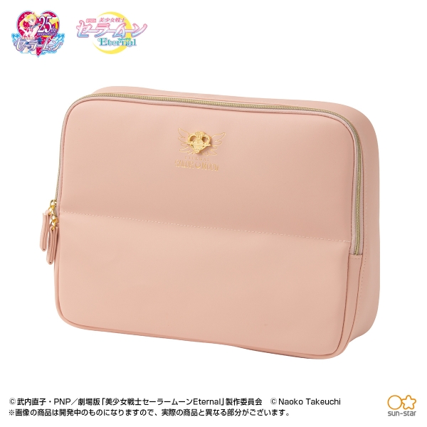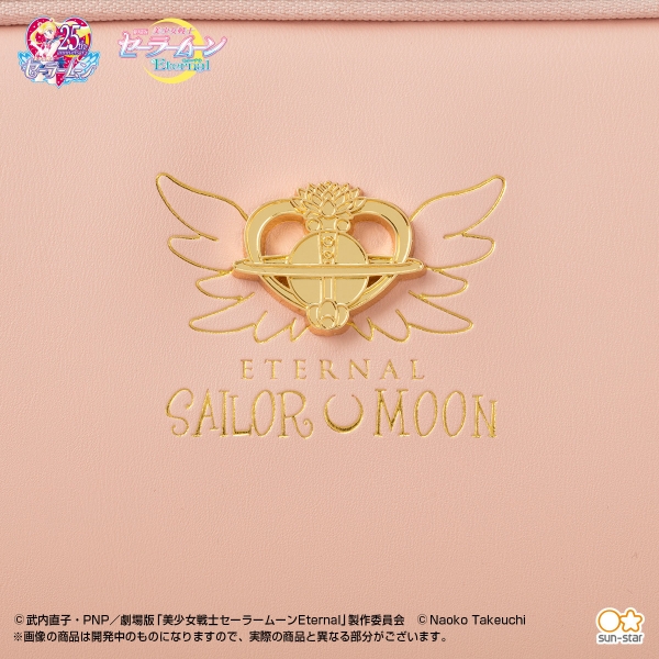 大人女子が持ちやすい、落ち着いたピンクカラーの生地を選びました。チャームは「エターナルセーラームーン」の持つアイテム「エターナル・ティアル」をアンティーク風にアレンジし、羽根をイメージした箔押しを施しました。外側はシンプルで、さりげなく作品らしさがアピールできるデザインです。