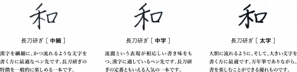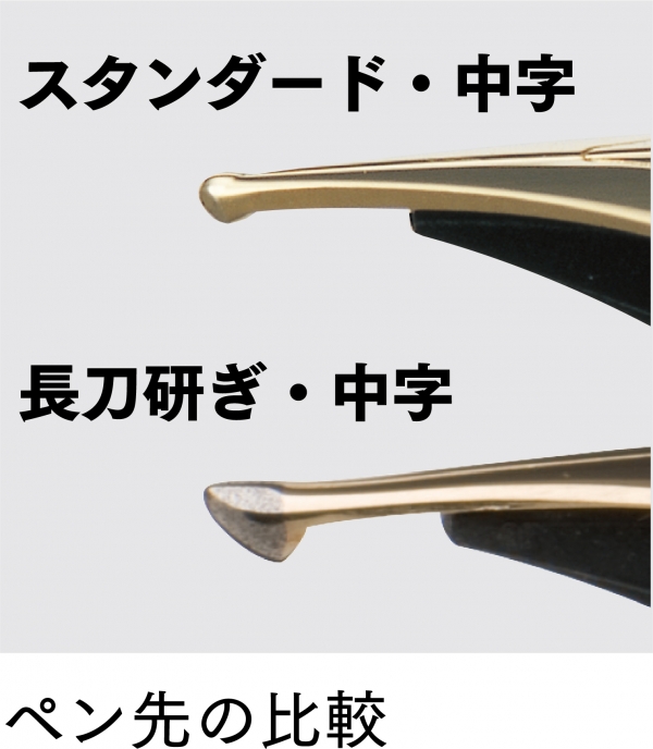 ペンを寝かせると太い線、立てると細い線が書けるという特長があり、トメ、ハネ、ハライなどが多い漢字を美しく筆記することができます。また、同じ字幅のスタンダードペン先と比べると太い線を書くことができます。筆圧をかけなくても滑らかな書き心地を実感できるペン先です。字幅は中細(MF)、中字(M)、太字(B) の3 種をラインアップ。
