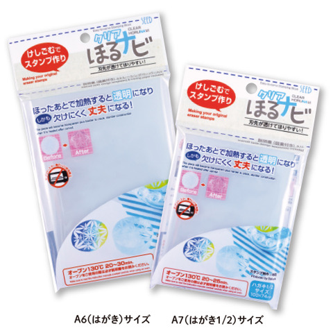 今回発売の「クリアほるナビ」は、刃先が透けて見える半透明消しゴムを採用で、ほりやすく、オーブンで加熱する事で透明になり、しかも欠けにくく丈夫になる。押したいところが透けて見えるから重ね押し図案に最適です