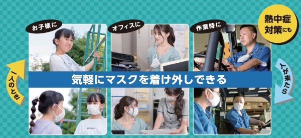 周りに人が居ない時、お子さまやオフィス、作業現場、熱中症対策として、気軽にマスクの付け外しができます。