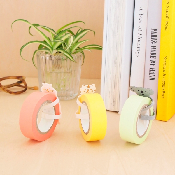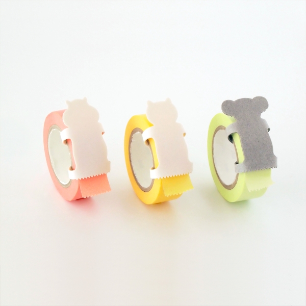 動物の両足部分を優しく曲げて、マスキングテープに装着し使用します。お尻部分のギザギザでテープをカットすることができるほか、本品がストッパーとなり、テープを机の上に飾ることもできます。動物がテープをぎゅっと抱きしめる姿がユーモラスで、デスク周りを明るく楽しく演出します。