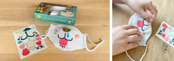 「へんしん!どうぶつマスク」は、コシのある生地を立体縫製した鼻・口まわりの空間確保できる形状と、やわらかく太い布紐と長さ調節パーツで、息苦しさや耳の痛みを感じにくく快適に着用できるマスクです。また、付属の布用シールをマスクに貼ることで、どうぶつに変身でき、小さなお子様でも楽しく着用することができます。