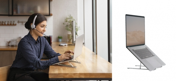 『快適ノートPCスタンド ユートリム ポータブル 収納ケース付』は、ノートパソコンの画面を高くし、視線をあげてらくらく姿勢。 キーボードに傾斜がつくことで、タイピングもしやすくなる。