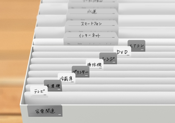書類整理の定番、インデックスファイルタイプ。A4サイズの書類が入る、厚さ0.5mm(通常の2.5倍)の不透明ファイルです。見出し部分の油性マーカーのメモは擦れても消えないため、引き出しや収納ボックスでの活用も適しています。また、ラベルプリンターも必要ありません。