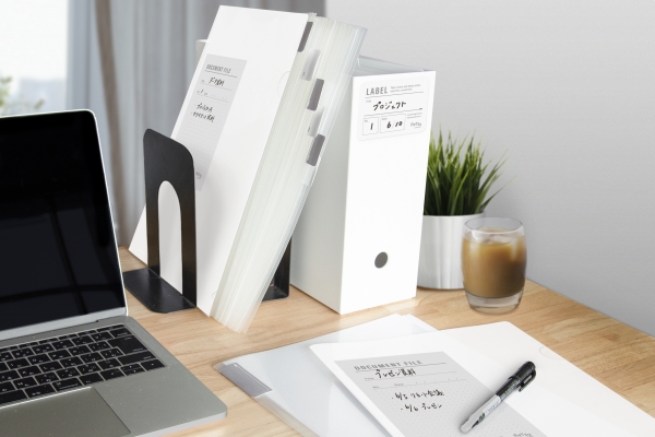 書類整理の定番、ドキュメントファイルタイプ。A4サイズの書類が入る、不透明ファイルです。普通のファイルは本体にメモをしたくてもできなかったり、強度の面で使い捨てになってしまいがち。本商品は厚さ0.5mm(一般的な製品の2.5倍)と分厚く頑丈で、油性マーカーでメモして消せるスペースも付いているため、使い捨てることなく半永久的に使用できます。出社予定日に必要な書類のメモや、書類の現状ステータス、収納書類順を記すなど使い方は様々。